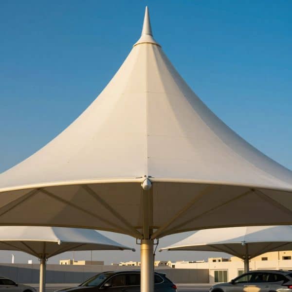 A classic curved design that mixes strength with coverage. We also offer fiber shade for car parking (GRP/Fiberglass) for areas needing rigid, permanent roofing.The curved “vault” shape naturally sheds dust and rare heavy rain, stopping the “mud pooling” that ruins flat shades.